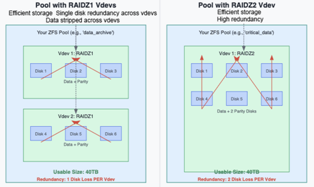 La redondance est toujours par vdev. Si un vdev échoue, l'ensemble du pool échoue, même si d'autres vdevs sont sains. Planifiez vos vdevs avec soin!